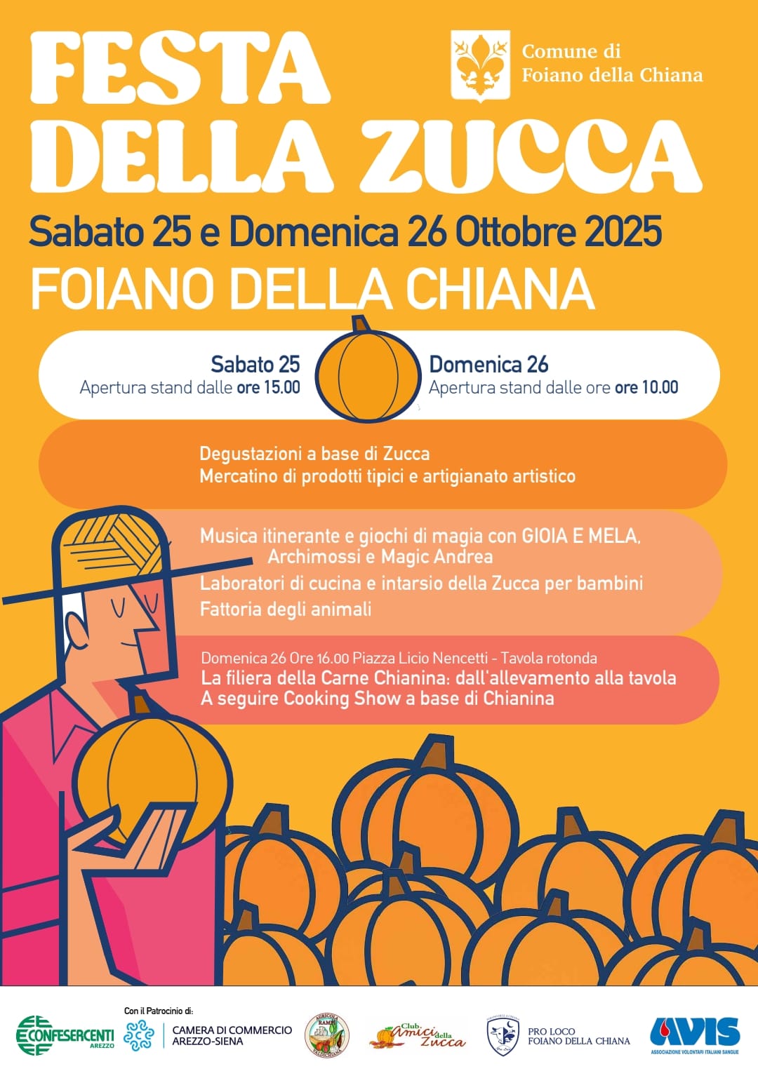 Dopo alcuni anni di interruzione, torna nel cuore di Foiano della Chiana la storica Festa della Zucca, uno degli appuntamenti più attesi della stagione autunnale, capace di unire agricoltura, tradizione e convivialità. L’evento, promosso dal Comune di Foiano della Chiana in collaborazione con Confesercenti, Assocazione Amici della Zucca e Pro Loco Foiano della Chiana, il patrocinio della Camera di Commercio di Arezzo-Siena e con il sostegno di numerose associazioni locali, animerà il centro storico sabato 25 (stand aperti alle 15) e domenica 26 ottobre (apertura dalle 10) con un programma di attività per tutte le età.