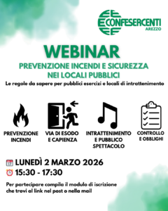 Per chiarire obblighi, responsabilità e adempimenti, Confesercenti Arezzo organizza un Webinar Informativo “PRevenzione Incendi e sicurezza nei locali pubblici” rivolto ai titolari e gestori dei pubblici esercizi.