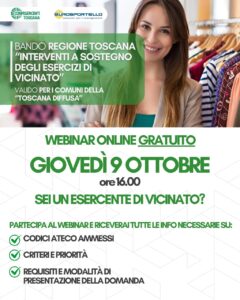 Si informa che è in programma per giovedì 9 ottobre alle ore 16 il webinar gratuito a cura di CONFESERCENTI TOSCANA ED EUROSPORTELLO